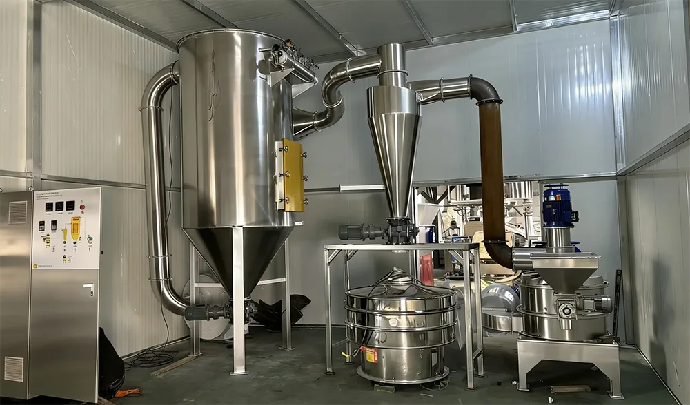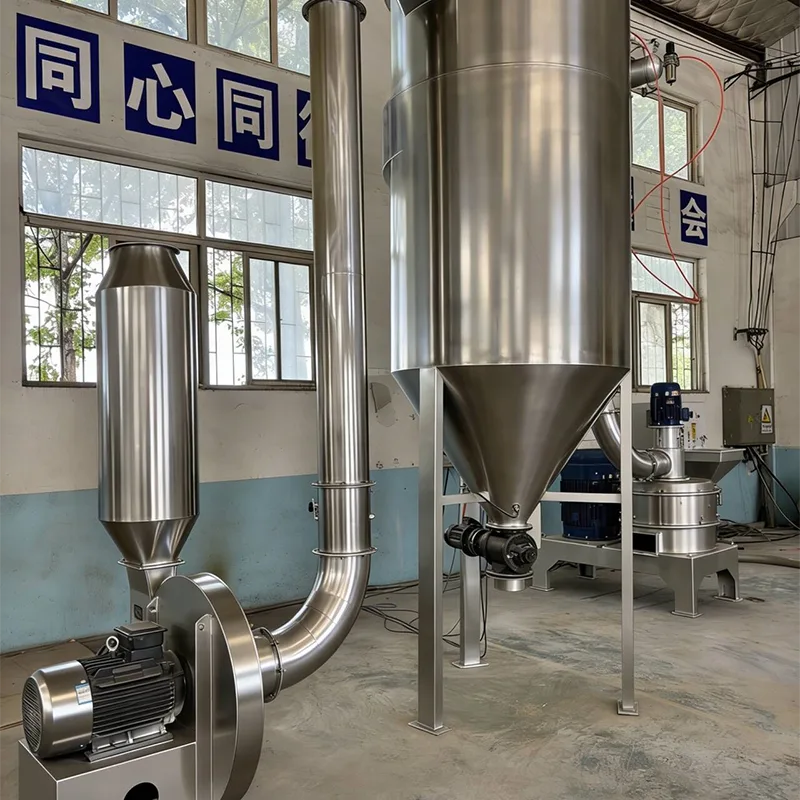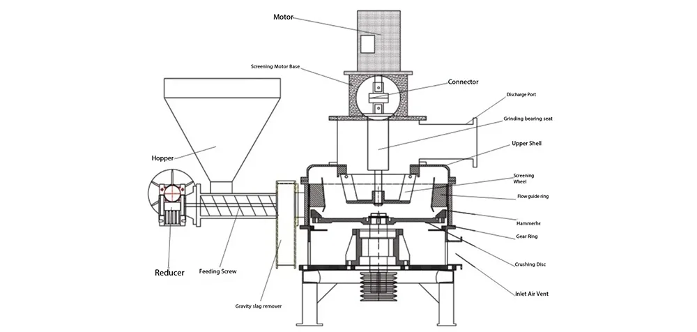 Aliran pemprosesan khusus adalah mudah: pertama, suapkan bahan mentah serbuk kasar dengan saiz zarah tidak lebih daripada 10mm ke dalam corong suapan, dan kemudian hantar ke ruang penghancuran pada kelajuan tetap melalui penyuap frekuensi berubah-ubah; Cakera pengisar dalam ruang pengisaran berputar pada kelajuan tinggi, memacu tukul pengisar dan penggelek pengisar berjalan serentak pada kelajuan tinggi, menjana daya emparan yang kuat, dan melemparkan bahan mentah serbuk kasar ke dalam dinding dalaman ruang pengisaran; Di bawah tindakan daya emparan, bahan mentah mengalami perlanggaran teruk, ricih, dan geseran dengan plat pelapik tahan haus, tukul penghancur, dan penggelek penghancur, menyelesaikan penghancuran awal; Selepas penghancuran awal, bahan akan dibawa ke dalam ruang pengelasan oleh aliran udara tekanan negatif yang dihasilkan oleh kipas draf teraruh. Roda pengelasan dalam ruang pengelasan berputar pada kelajuan tinggi untuk mengelas dengan tepat mengikut saiz zarah. Serbuk ultra-halus yang memenuhi keperluan (saiz zarah boleh dilaraskan mengikut keperluan) akan dibawa ke dalam pengumpul melalui aliran udara untuk melengkapkan pengumpulan; Serbuk kasar yang tidak memenuhi keperluan saiz zarah akan dipintas oleh roda penggredan dan dihantar semula ke ruang penghancuran untuk penghancuran sekunder sehingga mencapai standard saiz zarah yang ditentukan, memastikan keseragaman serbuk siap.