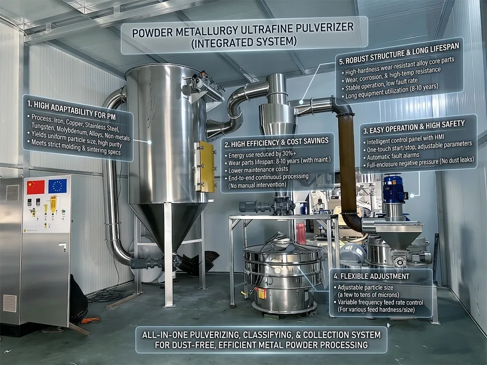 Penumbuk ultrafine metalurgi serbuk ialah peralatan khusus yang dibangunkan khusus untuk industri metalurgi serbuk. Ia digunakan terutamanya untuk pemprosesan ultrahalus serbuk logam, serbuk aloi, dan pelbagai bahan mentah serbuk bukan logam, dan boleh menyesuaikan dengan sempurna kepada keperluan pemprosesan bahan mentah keseluruhan proses pengeluaran metalurgi serbuk. Berbanding dengan peralatan penghancuran biasa, ciri yang paling menonjol dalam serbuk metalurgi ultrafine pulverizer adalah pematuhannya kepada piawaian ketat industri metalurgi serbuk, yang boleh mengawal dengan tepat saiz zarah serbuk, memastikan pengedaran zarah seragam, dan sepenuhnya mengelakkan pencemaran sekunder, memastikan ketulenan tinggi serbuk siap dan memenuhi sepenuhnya keperluan teras pembentukan, pembentukan seterusnya, dan lain-lain.