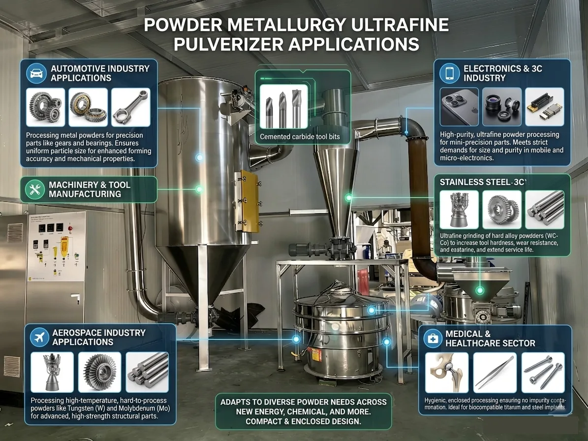 Pepulverizer ultrafine metalurgi serbuk digunakan terutamanya untuk pemprosesan ultrafine bahan mentah dalam keseluruhan industri metalurgi serbuk, dan boleh menyesuaikan diri dengan rawatan penghancuran pelbagai serbuk logam, aloi dan bukan logam. Ia digunakan secara meluas dalam pelbagai bidang seperti automotif, jentera, elektronik, aeroangkasa, perubatan, dan pembuatan alat. Senario aplikasi khusus adalah seperti berikut: